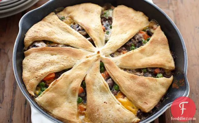 Place over meat mixture, with short sides of triangles along edge of skillet and points overlapping in center.
